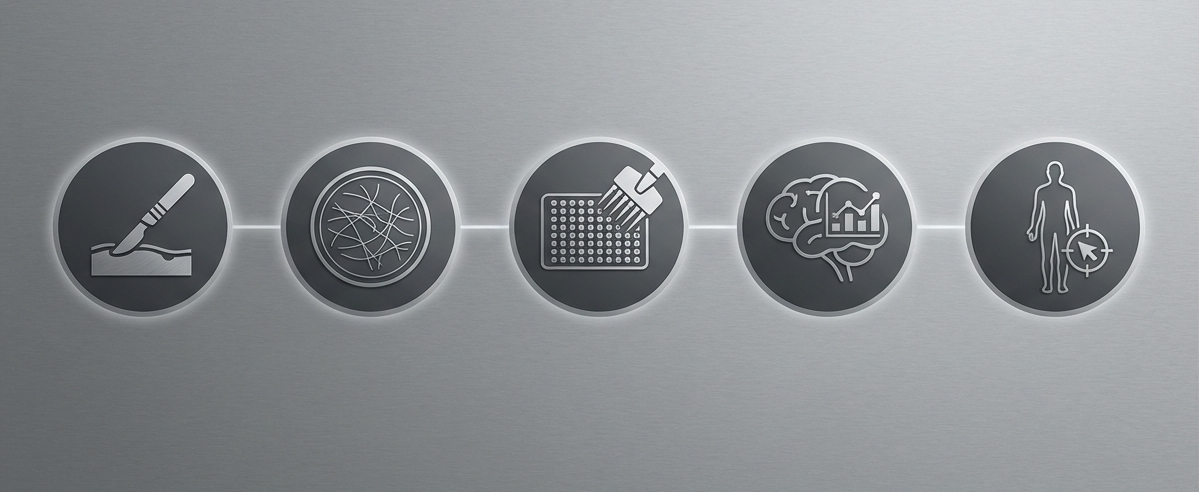 Our system reconstructs physiologically relevant 3D human tissues and applies architectural AI analysis to improve translational predictability in drug development.